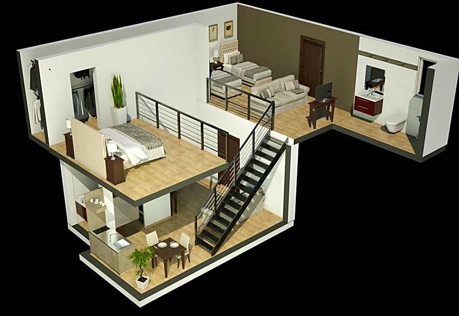 Large modern studio with a raised sleeping area, air conditioning, a kitchenette and a flat-screen TV. The private bathroom is fitted with a shower, free toiletries and a hairdryer.